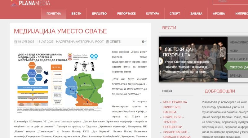 Učenici iz pet srednjih škola u Velikoj Plani, Smederevskoj Palanci, Kragujevcu, Despotovcu i Boru obučeni su da postanu vršnjački medijatori. Oni će u svojim školama održavati radionice, organizovati manifestacije i edukovati čak 1.500 svojih vršnjaka o tome kako se konflikti rešavaju mirnim putem.