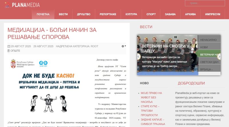 Udruženje „Svet reči“ pokrenulo je novi projekat pod nazivom „Dok ne bude kasno! Vršnjačka medijacija – potreba i mogućnost da se dođe do rešenja“ sa ciljem da edukuje adolescente o mirnom rešavanju konflikata.